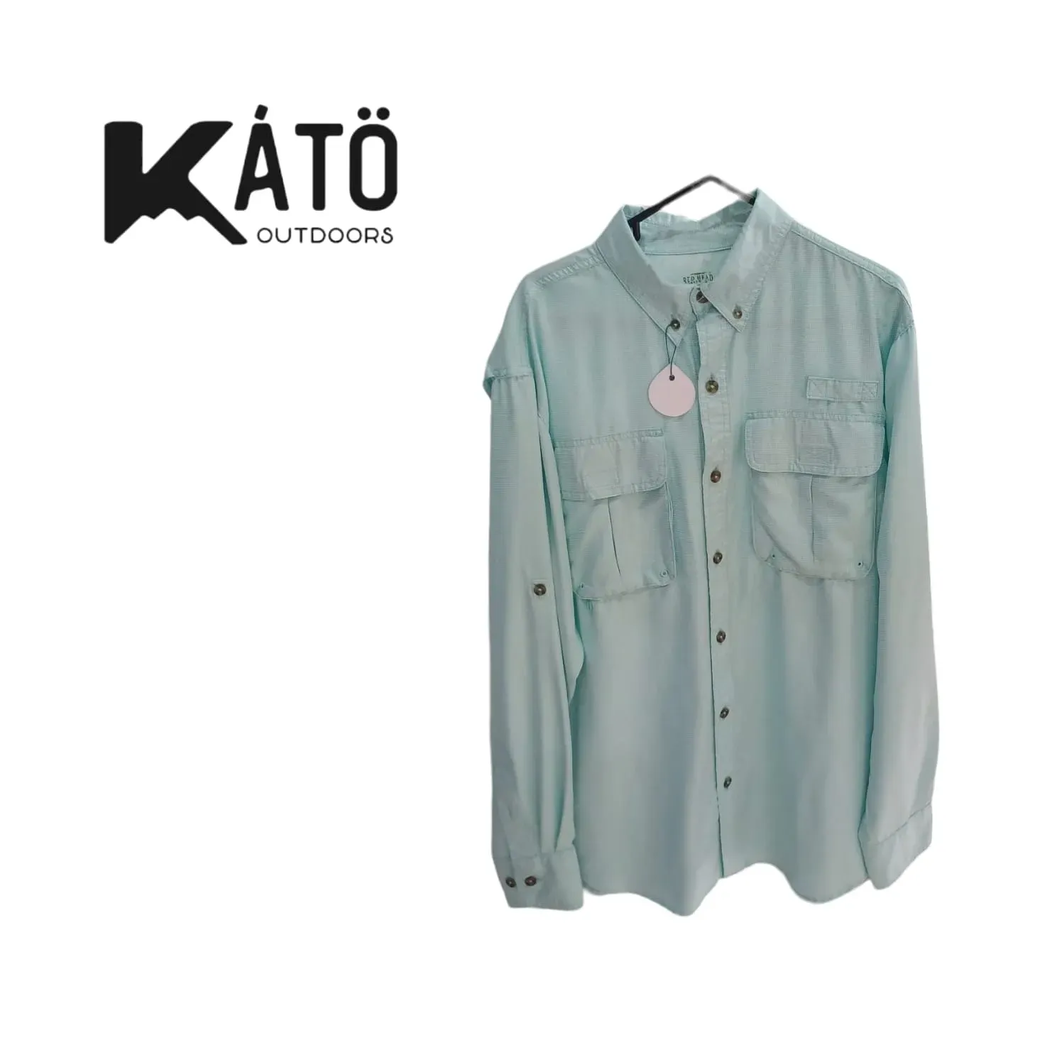 Una camisa azul claro de Kato Outdoors cuelga en una percha. Esta prenda es perfecta para disfrutar de la naturaleza en Costa Rica con estilo y comodidad. Hecha con materiales de alta calidad, esta camisa es ideal para aventuras al aire libre y actividades recreativas.